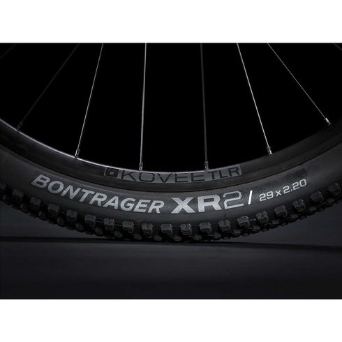 The bike utilizes Bontrager XR2 Comp wire bead tires. With the exception of the small size option of the X-Caliber 7, which uses 27.5×2.20” tires, all bikes ship with 29×2.20” tires.
