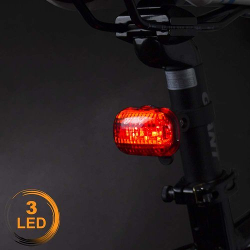 The 3 LED rear light of taillight features an angle-adjustable mount and shines at an intensity of 3 lumens. It takes 2 AAA batteries, and can also be mounted on saddlebags.
