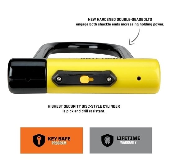 The double-deadbolt construction means that the lock secures at two points, so you don’t have to worry about a single failure causing the loss of your bike or other property. Similarly, the disc cylinder works well against any lockpicking or drilling attempts, so it keeps you secure for much longer.