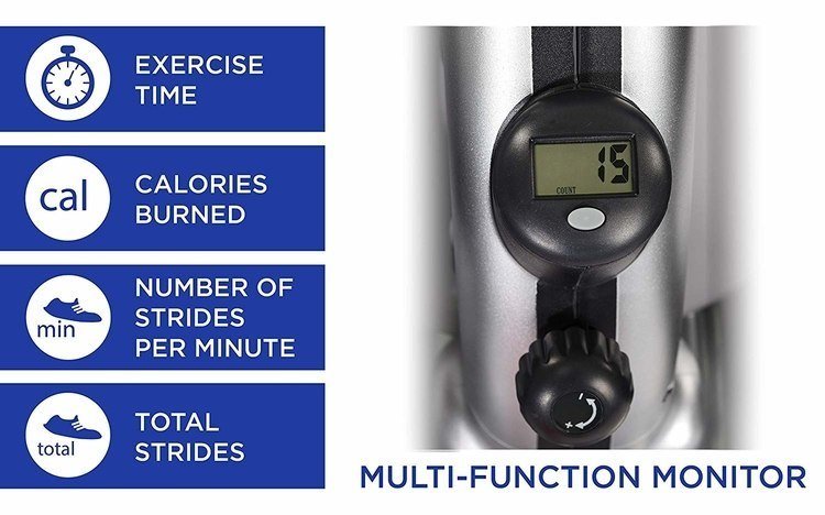 Track your workout stats in real time with a multifunctional monitor that displays vital stats about your workout performance, including no. of strides per minute, total strides, exercise time, and calories burned.