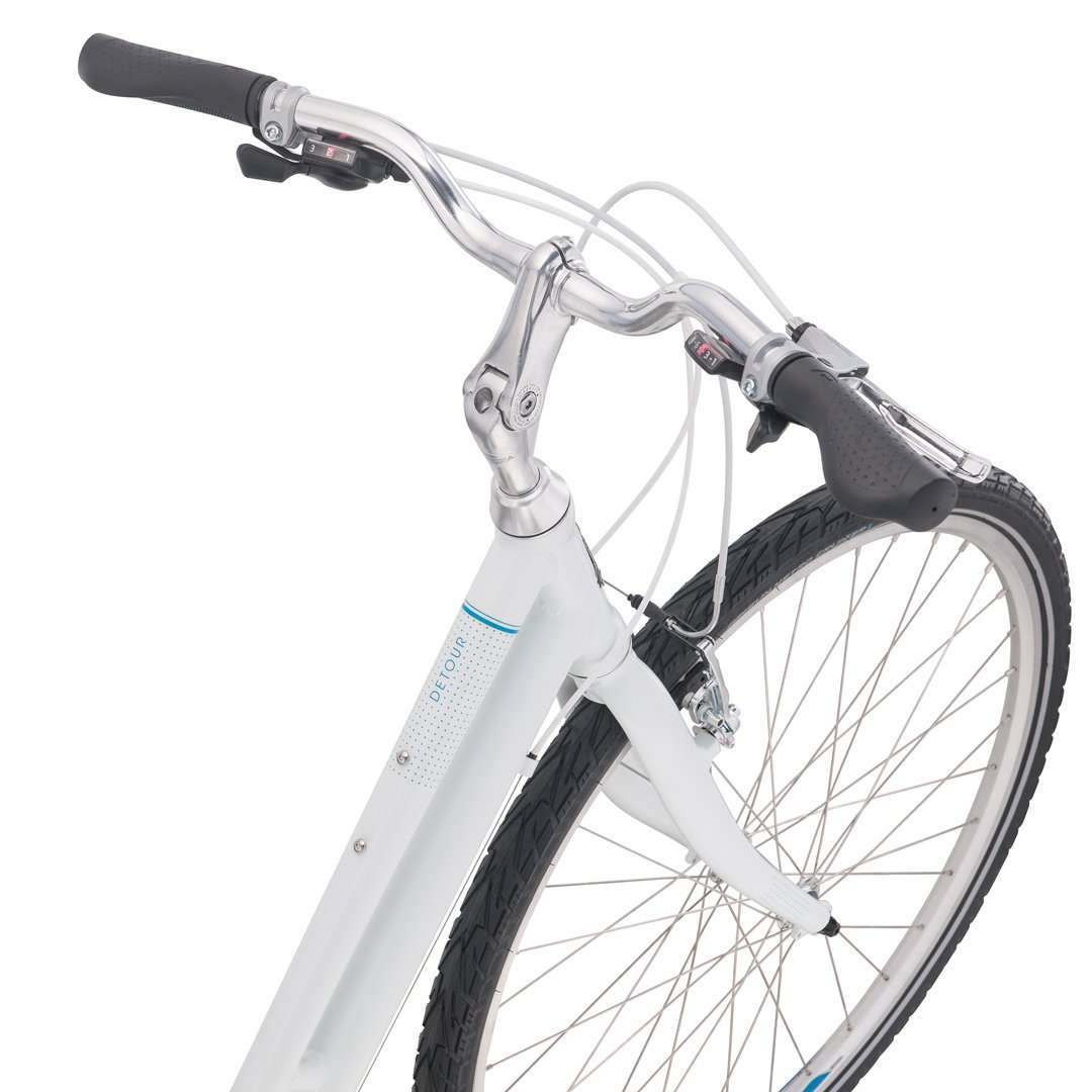 The wheels on the Detour 2 are full road bike wheels. This helps you gain speed, but you will notice that the tires are wider than the average road bike. This is a common feature with hybrids and one of the reasons why they are more versatile. The wheel size is 700c by 42c.