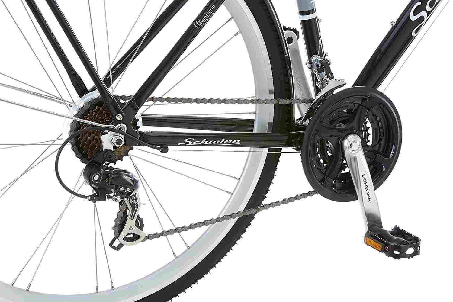 If you are looking for the ultimate hybrid bike that you can use for any type of riding, the Schwinn GTX Comfort Hybrid is the bike for you. This bike offers an aluminum frame with multi-use tires for road biking and off-roading. The drivetrain helps you achieve the speeds you need and the disc brake will effectively stop the bike in any conditions.