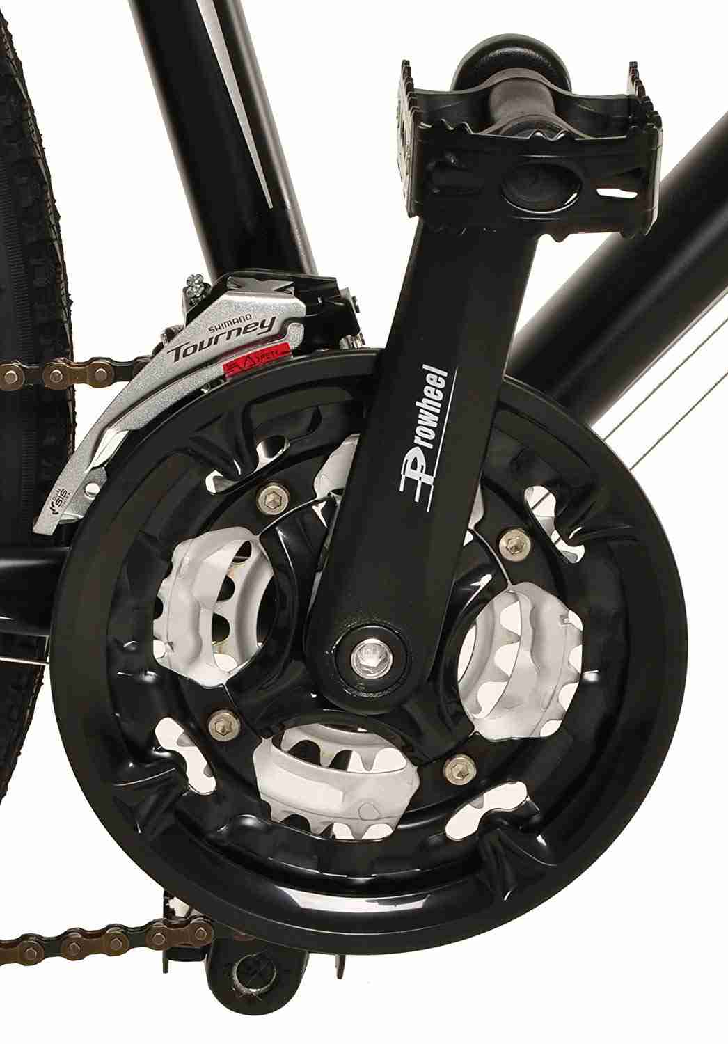 The drivetrain is made by Shimano and the bike has a Shimano rear derailleur. The rear derailleur offers a crisp and clean gear change while you ride.