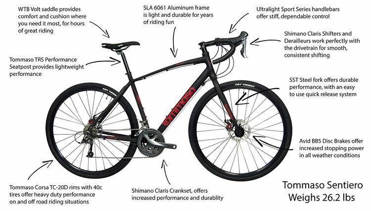 The Tomasso Sentiero touring bike is the best budget option on the market. It offers a solid aluminum frame with steel forks and Avid B5 disc brakes. The Shimano crankset gives you all the control you need while the saddle and handlebars provide the comfort you need for long rides.