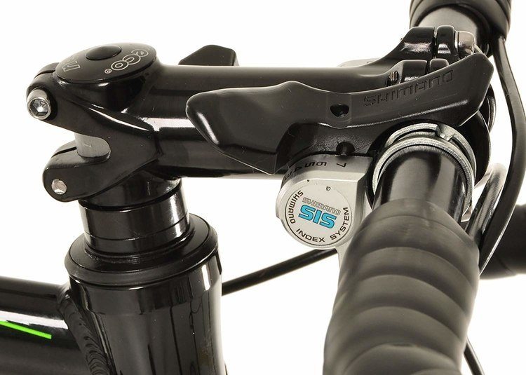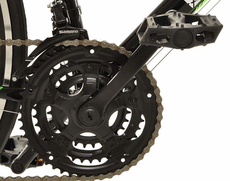 The crankset makes it easy to ride on flat terrain, climb hills or navigate rocky terrain. The Shimano Claris shifters on the handles work perfectly with the rest of the drivetrain for a smooth and consistent ride. While the crankset might seem intimidating for new riders, the 24 speeds are easy to use.
